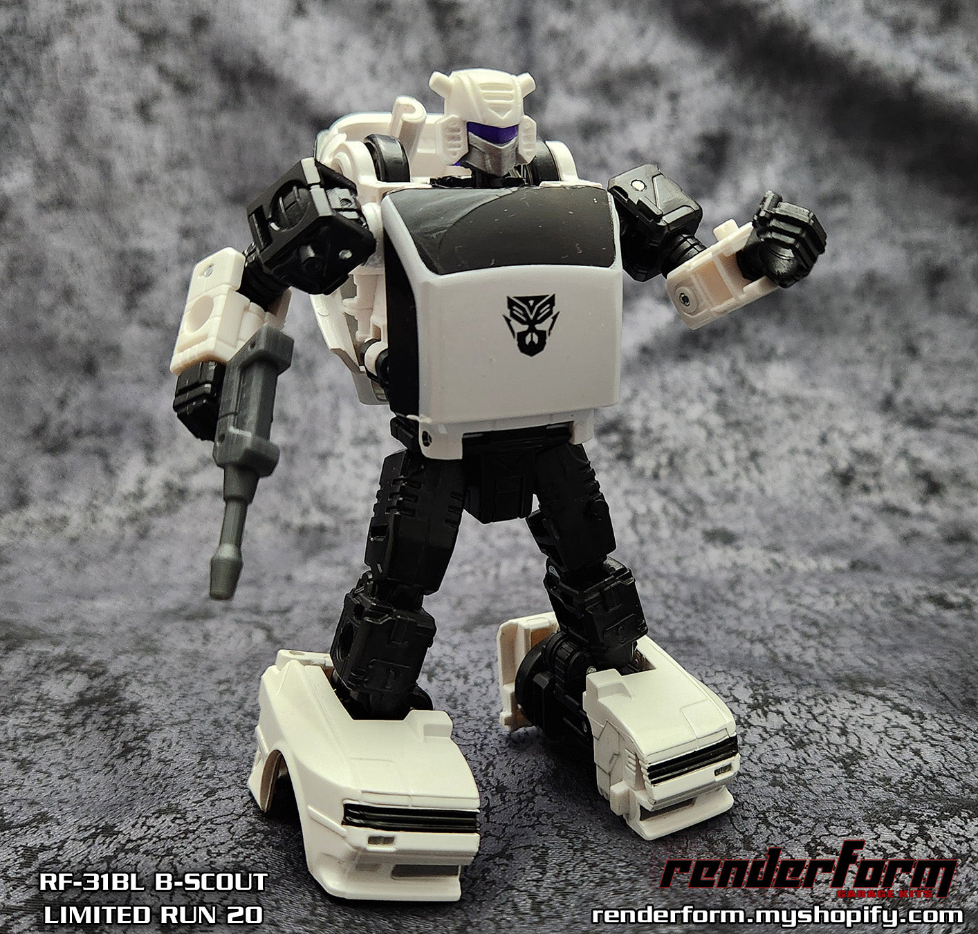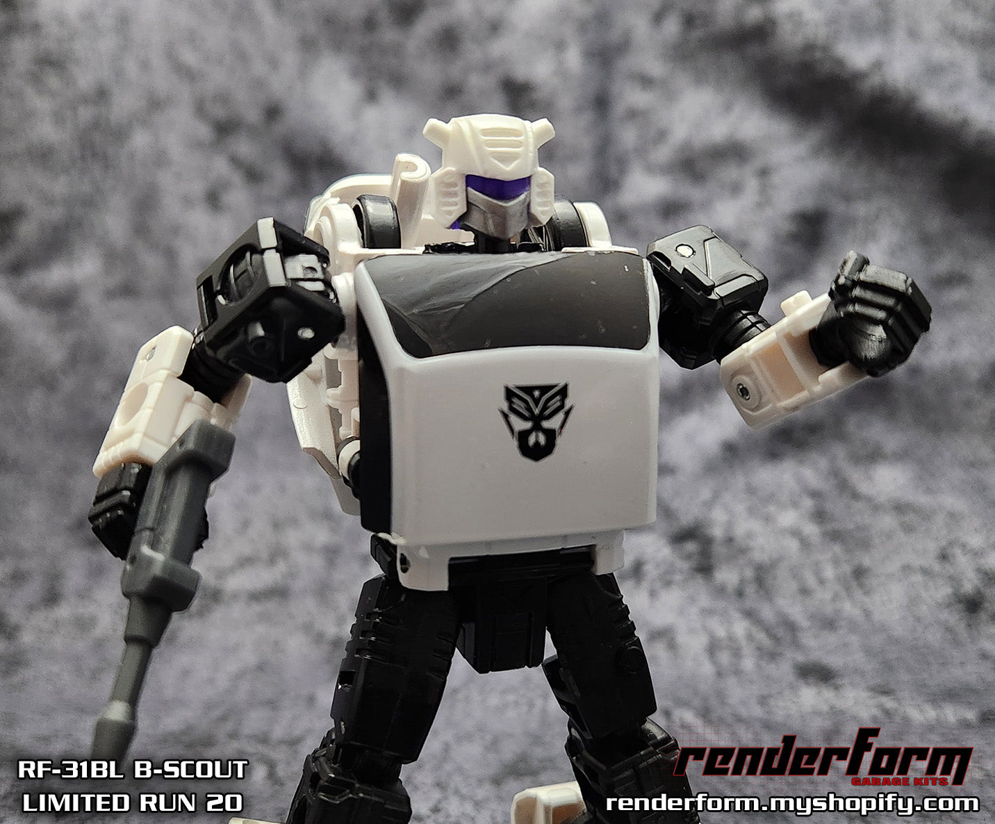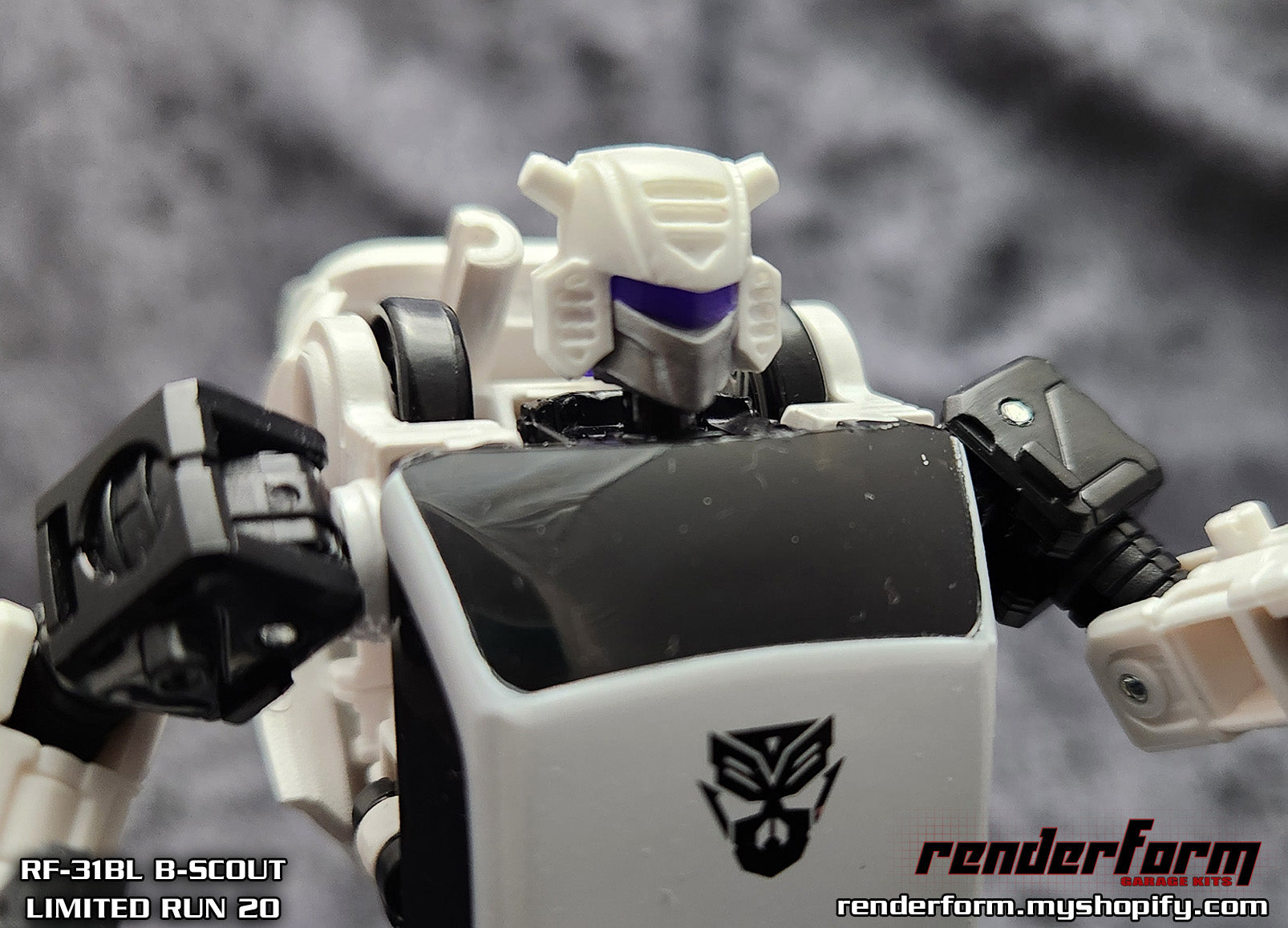The RF-31BL B-Scout upgrade head replaces the stock head on the Bugbite figure, and gives it a G1 toy accurate head sculpt. The head is comprised of 4 separate parts, cast in colored resin. The visor is made in translucent purple resin, giving a light piped effect. Includes a random bonus 3D printed gun, based on G1 Bumblebee's cartoon pistol.